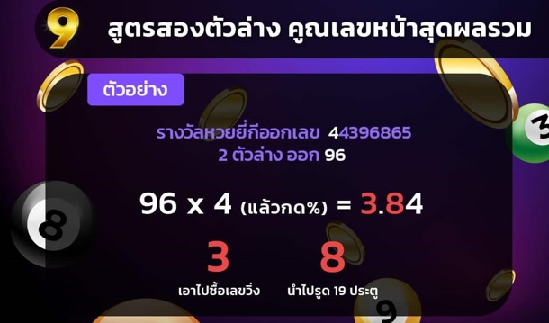 สำหรับสูตรสองตัวล่าง คูณเลขหน้าสุดผลรวมนี้เป็นการนำเลขรางวัล 2 ตัวล่าง มาคูณกับเลขหน้าสุดของผลรางวัล จากนั้นกด % บนเครื่องคิดเลข ก็จะได้เป็นตัวเลขทศนิยมออกมา ให้นำเลขด้านหน้าจุดทศนิยมและหลังจุดทศนิยม 1 ตำแหน่ง มาแทงหวยยี่กี่ในรอบถัดไปได้เลย ทั้งการรูด 19 ประตู และการวิ่ง (รูด19ประตู นี้ก็เหมือนกับการแทงเลขแบบ 2 ตัวธรรมดานั่นแหละ เพียงแต่ในเว็บหวยจะมีฟังก์ชั่น 19 ประตูขึ้นมา เพื่อให้คุณไม่ต้องไปไล่กดทีละตัวหรือพิมพ์เลขให้ครบ 19 ตัว ส่วนอัตราการจ่ายก็เท่ากับการจ่ายเลข 2 ตัวบนล่างปกติเลย) โดย สูตรสองตัวล่าง คูณเลขหน้าสุดผลรวมนี้ อาจจะใช้ทุนเยอะไปสักนิดในการเล่นในแต่ละรอบ แต่หากในรอบๆนั้นถูก ก็รับรองว่าคุ้มค่าแน่นอน